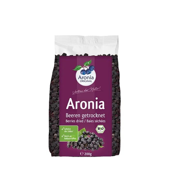 Unsere schonend getrockneten Aroniabeeren können auch pur und direkt aus dem Beutel genascht werden. Ihr hoher Anteil an sekundären Pflanzenfarbstoffen, den Anthocyanen, liefert Ihnen beim Verzehr eine extra Portion Gesundheit. Sie suchen nach "Aronia getrocknet" ? Dann sind unsere leckeren Aroniabeeren genau richtig für Sie!